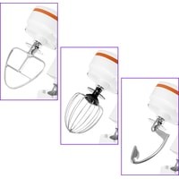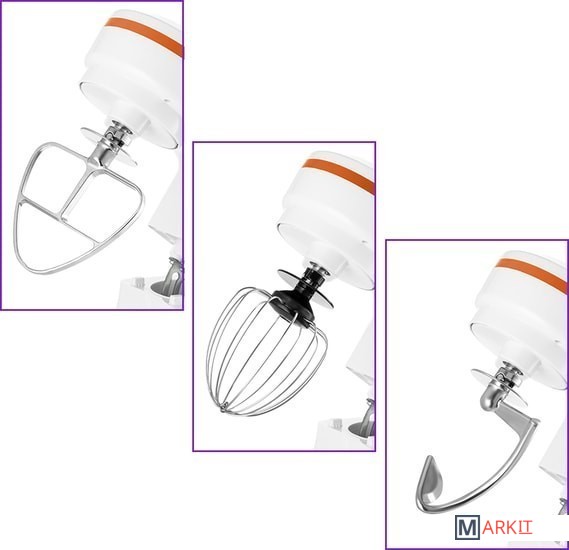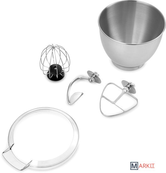 Полная комплектация - моторный блок;- чаша миксера;- крышка чаши миксера;- венчик для сбивания;- насадка для смешивания;- крюк;- руководство по эксплуатации.